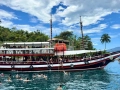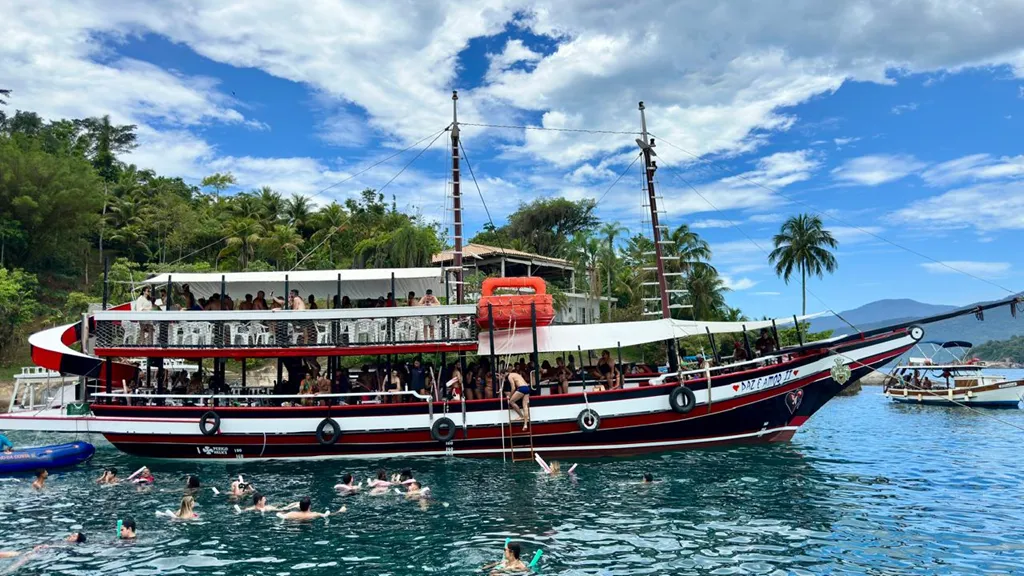 A Escuna Paz e Amor II é uma embarcação com dois andares que realiza o tradicional passeio pela baía de Paraty.