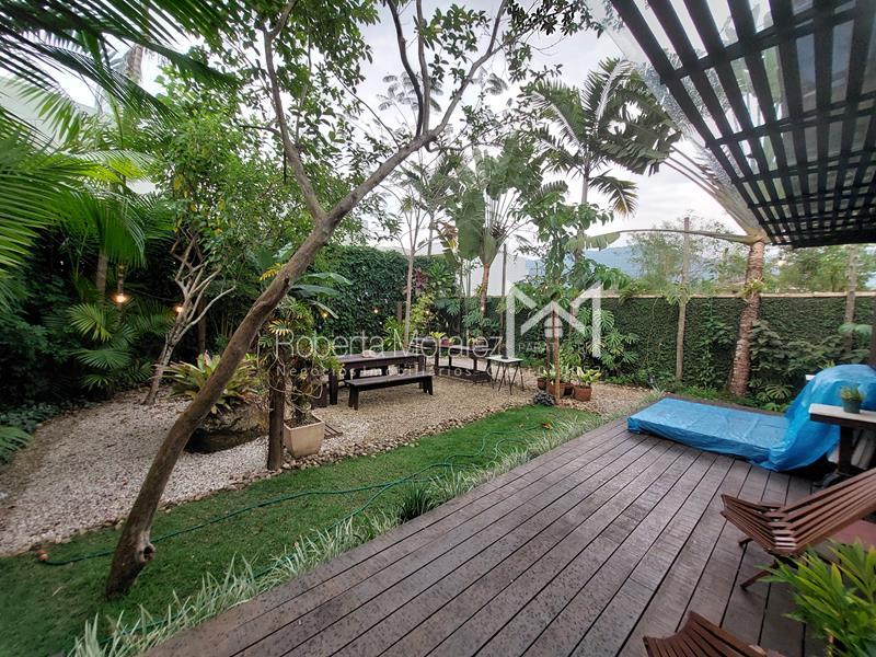 A casa possui jardim vertical isolando visualmente toda propriedade, mantendo apenas vista para as montanhas, um projeto elaborado com a construção em deck permitindo passagem de ar e evitando excesso de umidade.