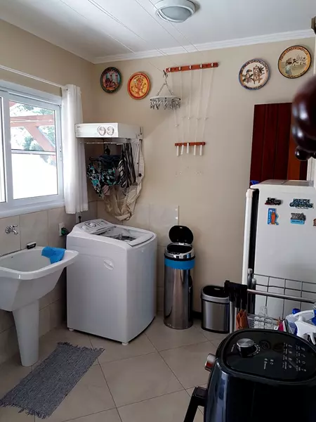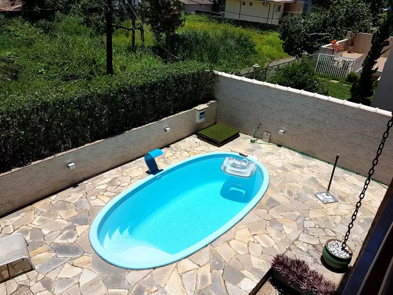 Dispõe de um amplo quintal todo gramado cercado de muito verde, garagem coberta, uma linda piscina, 1 cômodo para guardados, área gourmet e 1 lavabo em sua área externa.