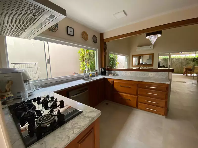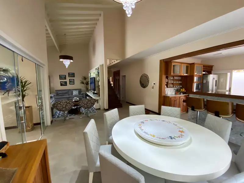 A casa possui três lindas suítes no andar superior e uma suítes com varada e jardim privativo no andar térreo. Salas de estar e TV, cozinha integrada com sala de jantar, escritório, lavabo, área de serviço completa e banheiros completo para atender a área externa.