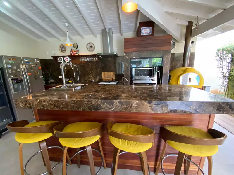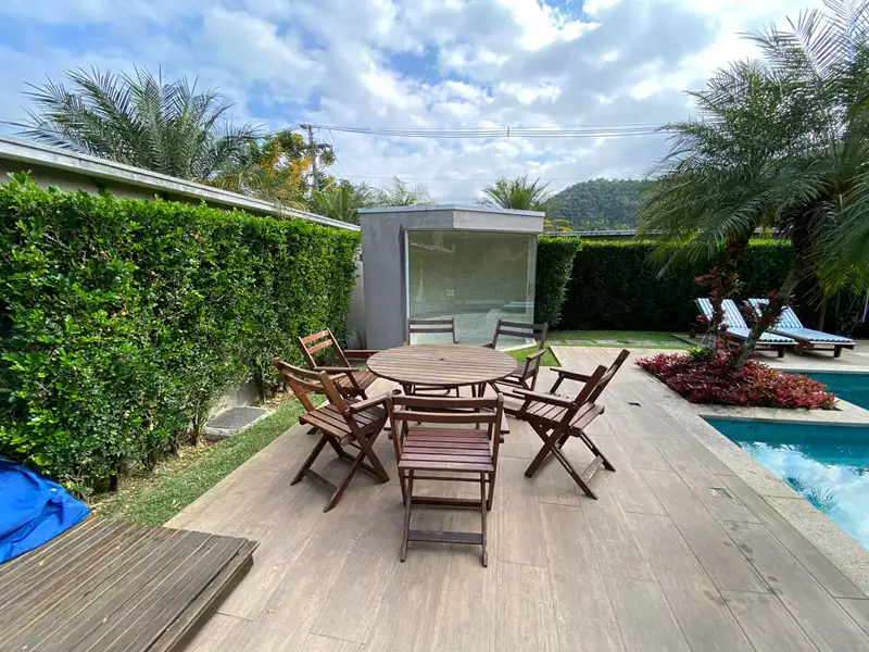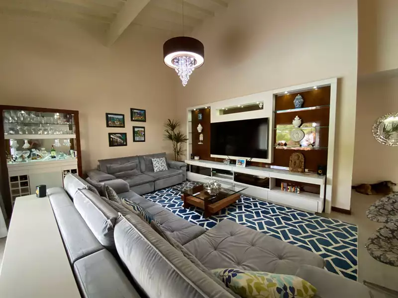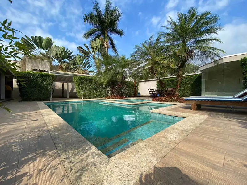 Construída com madeiras nobres, pedras selecionadas (cozinha em mármore Carrara), moveis planejados e amplas portas e janelas envidraçadas que dão visão para o exuberante jardim, área gourmet completa, piscina, sauna e lago.