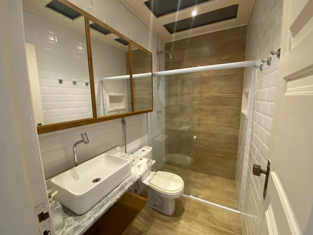 No andar superior 2 quartos e um quartinho que serve como escritório no térreo 2 suítes, mais banheiro completo, varanda com frente para a piscina do condomínio aquecida, área gourmet independente e garagem fechada
